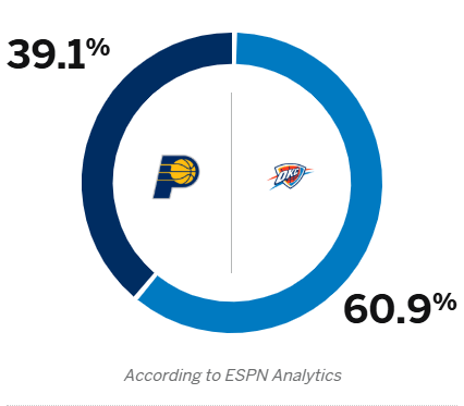 ESPN预测雷霆与步行者G5胜率:雷霆60.9%,步行者39.1%